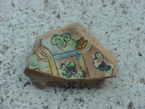 Scodella con piede ad anello leggermente umbonato e attaco di parete a profilo emisferico. All'interno del cavetto compare un motivo geometrico stilizzato, con il "nodo di Salomone" marcato da pennellate di colore blu, verde e giallo e campito da piccoli fiori polilobati.