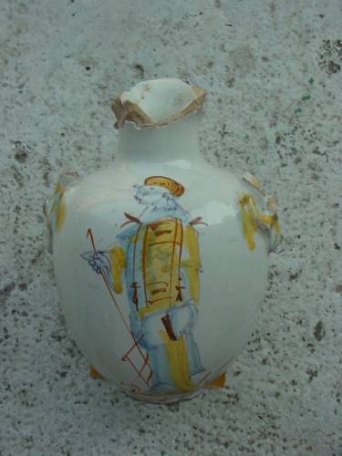 Fiaschetta con piccolo piede a disco, corpo a profilo ovoidale, spalla, breve collo cilindrico e attacco di due ansette laterali a sezione nastriforme, andate perdute. Il corpo è decorato con le figure di due santi volti a sinistra, che reggono con la mano sinistra un bastone.