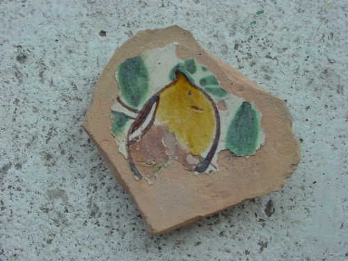 Piatto con piede ad anello e attacco di parete con profilo quasi orizzontale. All'interno nel cavetto è presente un grande frutto giallo e marrone, forse un limone, appeso ad un sottile ramo da cui dipartono alcune foglie di colore verde.