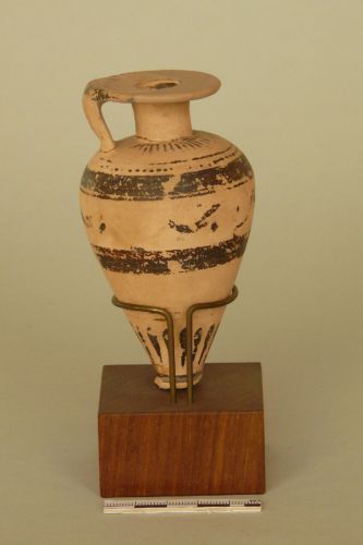 orlo a disco piatto, ansa irregolare a nastro, fissata all'orlo e alla spalla arrotondata, breve collo cilindrico, ventre piriforme slanciato, fondo concavo con piede a disco. Argilla ben depurata color camoscio rosato; vernice bruno scuro opaca in alcuni punti più spessa e in altri più chiara anche a causa di difetti nella cottura. La decorazione consiste, sull'orlo in sottili e fitti raggi concentrici, che si ripetono sulle spalle, delimitati da una linea sottile e da una fila di puntini e sul corpo in quattro animali in corsa (cani?), ormai quasi illeggibili, disposti tra due larghe fasce orizzontali. In corrispondenza del fondo del ventre sono presenti altre tre sottili linee orizzontali e in corrispondenza dell'attacco al piede verniciato, un motivo di foglie ascendenti.