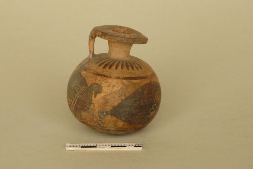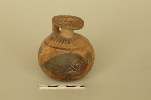 orlo a disco piatto, ansa verticale a nastro fissata all'orlo e alla spalla arrotondata, breve collo cilindrico, ventre globulare e fondo leggermente convesso. Argilla camoscio chiaro e vernice bruna opaca con ritocchi in rosso paonazzo. La vernice bruna disegna sul disco e sullo spessore dell'orlo raggi concentrici, due strisce orizzontali sull'ansa e un motivo a linguette sulle spalle. Sul corpo, tra due strisce orizzontali sono disegnati tre grossi volatili (cigni?) verso destra, ad ali chiuse, con un grande occhio rotondo e penne delle ali incise; il petto degli uccelli è in rosso paonazzo sovrapposto. Sul fondo, una piccola depressione centrale è circondata da una striscia oltre la quale sono stati disegnati dei raggi.