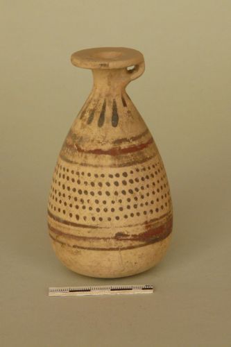orlo a disco piatto, breve collo cilindrico, ansa ad occhiello fissata all'orlo e al collo, ventre ovoidale e fondo leggermente convesso. Argilla camoscio chiaro e vernice bruna opaca con ritocchi in rosso paonazzo. La vernice bruna copre il disco e lo spessore dell'orlo, disegna due punti sull'ansa e un motivo a foglie nella parte superiore del ventre. La parte centrale del vaso presenta una decorazione costituita da sei file di grossi punti racchiuse tra due larghe fasce in vernice bruna con al centro una striscia in rosso paonazzo sovrapposto.