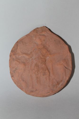 Ampolla di grandi dimensioni, con corpo "a borraccia" di forma circolare e attacco di breve collo a profilo troncoconico. Sui due lati dell'ampolla è raffigurato lo stesso soggetto: San Menas, che indossa una tunica manicata e una clamide fissata sulla spalla destra da una croce latina, è rappresentato in atteggiamento di orante con le braccia aperte rivolte verso l'alto. Ai suoi lati sono presenti due cammelli inginocchiati, resi con tratti stilizzati. All'altezza del capo è presente l'iscrizione San Menas in lettere greche, ora quasi completamente evanida.