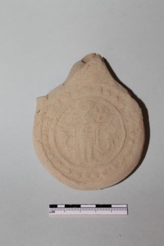 Ampolla di medie dimensioni, con corpo "a borraccia" di forma circolare e attacco di breve collo a profilo troncoconico. Sui due lati dell'ampolla è raffigurato lo stesso soggetto: racchiuso entro una cornice perlinata San Menas, che indossa una tunica manicata e una clamide fissata sulla spalla destra da una croce latina, è rappresentato in atteggiamento di orante con le braccia aperte rivolte verso l'alto. Ai suoi lati sono presenti due cammelli inginocchiati, resi con tratti stilizzati.