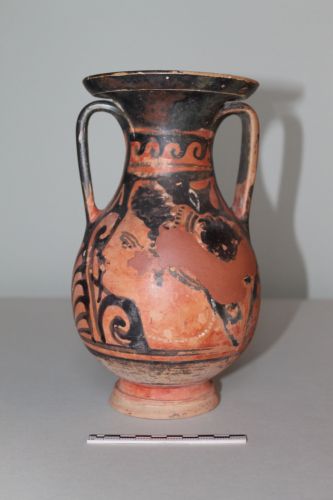 Pelike con piccolo piede troncoconico con solco al taglio e breve raccordo cilindrico, corpo a profilo globoso che si stringe all'altezza della base del collo per svasarsi nel labbro estroflesso e sagomato. Le due anse a nastro speculari sono piatte all'esterno e leggermente convesse all'interno.