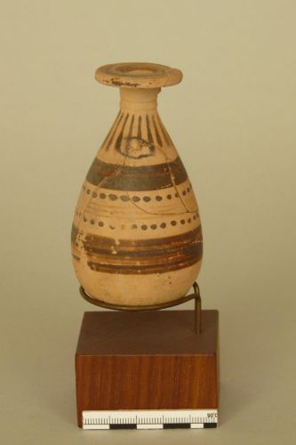 orlo a disco piatto, breve collo cilindrico con collarino in rilievo, ansa ad occhiello, ventre ovoidale e fondo leggermente convesso. Argilla camoscio chiaro e vernice bruna opaca con ritocchi in rosso paonazzo. La vernice bruna disegna due linee concentriche sul disco e copre lo spessore dell'orlo e disegna un motivo a foglie nella parte superiore del ventre. La parte centrale del vaso presenta una decorazione costituita da due file di grossi punti, separate da tre righe sottili realizzate in vernice diluita, racchiuse tra due larghe fasce in vernice bruna con al centro una striscia in rosso paonazzo sovrapposto.