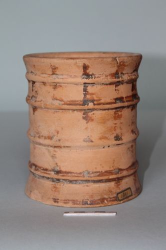 Pisside con piede a disco leggermente svasato, come l'orlo, e corpo a profilo cilindrico caratterizzato da sei cordoni orizzontali paralleli. Il corpo è marcato da una sequenza di pennellate verticali di colore rosso-marrone.