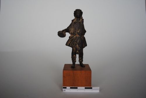 Statuetta di Lare. La divinità è in riposo, stante sulla gamba destra, con corta tunica fermata da cintura in vita; dalla spalla sinistra scende il mantello arrotolato a sciarpa che passa sotto la cintura. Ai piedi alti calzari a lacci. La testa è cinta da una corona di alloro. Nella mano destra una patera; quella sinistra, mancante, doveva reggere una cornucopia.