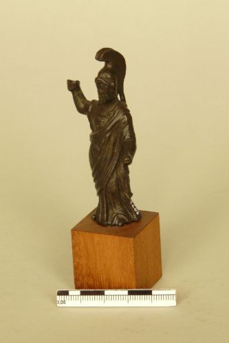 la dea è raffigurata stante sulla gamba destra, mentre la sinistra è leggermente flessa ed arretrata e indossa un chitone lungo fino ai piedi, coperto sul petto dall'egida squamata con bordo rilevato e gorgoneion; il braccio destro doveva reggere nella mano chiusa a pugno, l'asta, il sinistro proteso, invece un attributo, forse lo scudo. La testa, impostata sul collo largo, è coperta da un elmo con alto lophos e paragnatidi sollevate, mentre il volto, di cui sono riconoscibili solo gli occhi ad amigdala incisa, è incorniciato dai capelli spartiti sulla fronte.