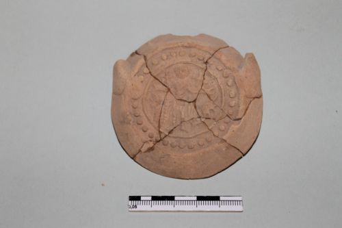 Ampolla di medie dimensioni, con corpo "a borraccia" di forma circolare e attacco di breve collo a profilo troncoconico. Sul solo lato dell'ampolla conservato, racchiuso entro una cornice perlinata è raffigurato San Menas, che indossa una tunica manicata e una clamide, è rappresentato in atteggiamento di orante con le braccia aperte rivolte verso l'alto, dietro le quali sono presenti due croci latine. Ai lati del Santo sono presenti due cammelli inginocchiati, resi con tratti stilizzati.