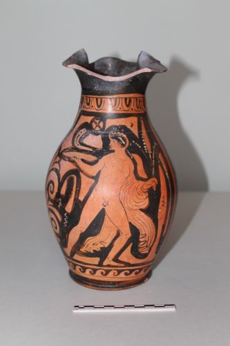 Oinochoe con piede a disco sagomato, corpo ovoidale a profilo continuo, breve collo cilindrico e bocca trilobata, priva del versatore. La scena figurata che decora il corpo del reperto è delimitata superiormente da una fascia di ovuli e inferiormente da un motivo a onda. Nello spazio così definito è presente un giovane nudo volto a destra, con il capo rivolto a sinistra; sorregge l'himation con il braccio destro mentre con la mano sinistra sorregge un piatto con offerte. La mano destra sembra stringere in racemo floreale terminante con una inflorescenza sottile e allungata. Intorno alla figura sono presenti diversi motivi vegetali, variamente stilizzati.