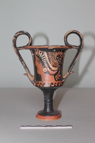 Kantharos con piede a disco modanato, alto stelo marcato da una evidente costolatura mediana in rilievo, lungo corpo cilindrico, orlo estroflesso arrotondato e due anse speculari, apicate, sopraelevate e ritorte.