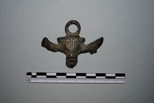 Pendaglio apotropaico a forma di testa di toro con due appendici laterali, quella di destra a forma di fallo, quella di sinistra a forma di pugno chiuso. In basso è desinente in un altro fallo. Largo anello di sospensione. Gli anelli per i pendagli sono spezzati.
