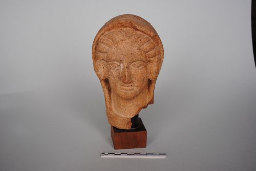 Testa femminile velata lacunosa alla base del collo. Volto dalle forme piene con occhi allungati, palpebre rilevate e indicazione delle pupille; naso aquilino; mento sporgente. Capelli spartiti sulla fronte in ciocche rigonfie, scendenti ai lati del viso in grossi boccoli. Velo rialzato e sporgente. Retro convesso. Terracotta arancione.