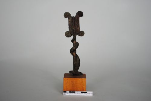 Bronzetto a forma di timone con asta a sezione cilindrica; terminazioni angolari a volute contrapposte, con doppi girali incisi e àncora centrale. All'asta è avvolto un delfino con una conchiglia sotto la bocca (la conchiglia sembra una pinna caudale).