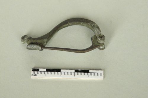 fibula con cerniera con perno in ferro, larga testa di forma trapezoidale e arco a sezione quadrangolare, staffa rettangolare chiusa, desinente a pomello profilato. Ardiglione a sezione quadrangolare.