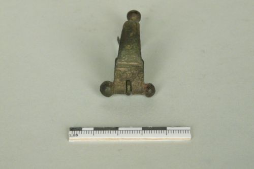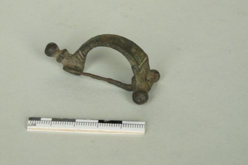 fibula con cerniera con perno in ferro chiuso ai lati da due globetti in bronzo, larga testa di forma trapezoidale e arco a sezione quadrangolare decorati con motivo ad occhi di dado e staffa rettangolare chiusa, desinente a pomello profilato. L'arco, nel punto di raccordo con la staffa presenta due tacche incise. Ardiglione a sezione quadrangolare.