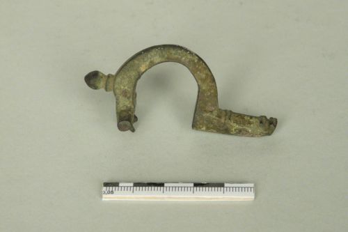 braccio trasversale a sezione subesagonale, arco semicircolare a sezione trapezoidale teminante nel bottone centrale a forma di testa di cipolla profilato; piede decorato da motivi lineari incisi.