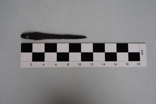 Probabile lancetta con corpo di forma rettangolare, affusolato ad una estremità. L'altra presenta un foro circolare passante.