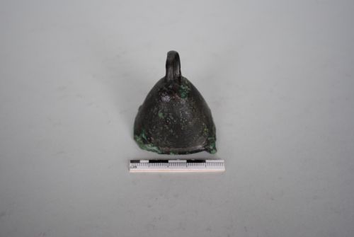 Campanello troncopiramidale con due peducci conservati a forma di globetto. Grande presa ad anello con foro passante. Mancante del batacchio.