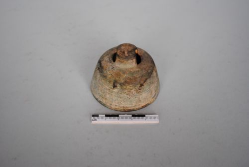 Tintinnabulum/campanello di forma cilindrica e base circolare. Largo anello stondato, con foro passante.