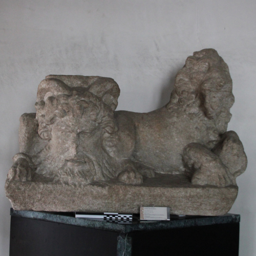Leone che cattura un ariete accanto ritratto di Zeus Ammon