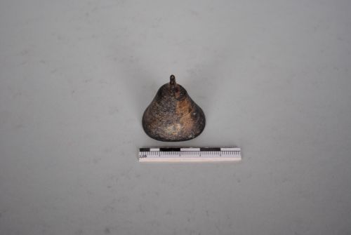 Tintinnabulum/piccolo campanello di forma cilindrica con base circolare deformata. Presa di forma rettangolare con foro passante circolare.