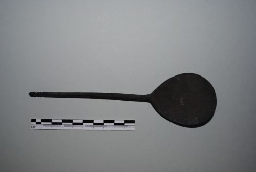 Cucchiaio a conca profonda, di forma ovale; manico a sezione poligonale terminante in due modanature e una pigna consunta.