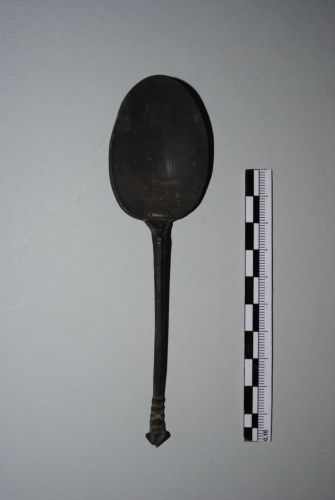 Cucchiaio con conca ovale poco profonda. Manico leggermente angolato a sezione poligonale, terminante in uno zoccolo.