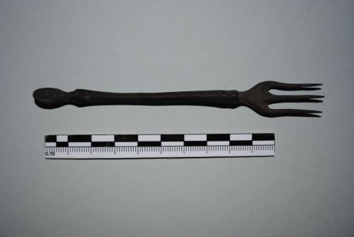 Forchetta a tre rebbi piccoli su base stondata. Manico angolato a sezione circolare, terminante in uno zoccolo.