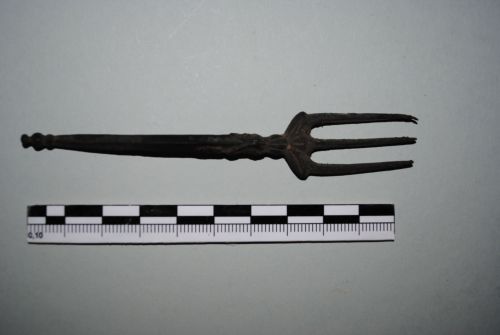 Forchetta a tre rebbi su base angolata. Manico poligonale modanato e terminante in un globetto.