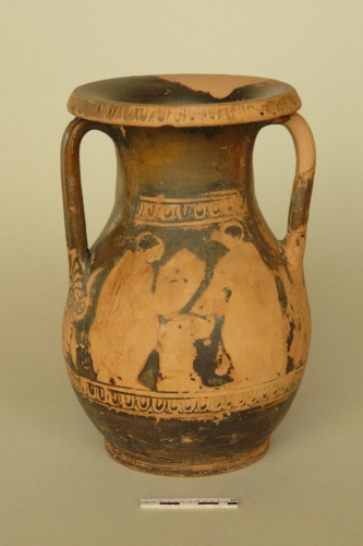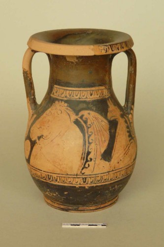 largo orlo rovesciato verso il basso, anse a nastro con costolatura centrale; corpo ovoide, piede a tondello con profilo modanato. Sul bordo rovesciato, tra le anse e sotto la zona figurata, fascia di ovuli; sotto le anse doppie palmette con girali laterali.