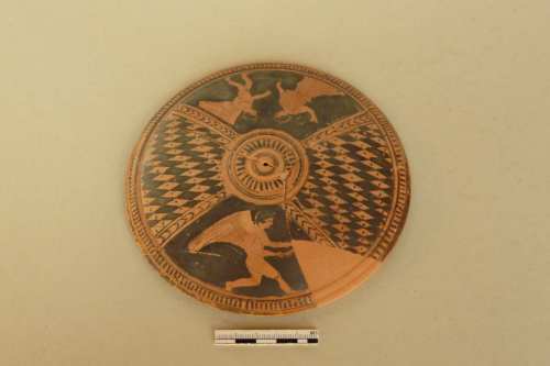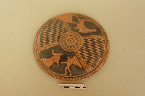 forma lenticolare, con orlo interno molto basso che doveva appoggiare sul corpo della pisside; la presa consisteva probabilmente in un anello in bronzo fissato sulla sommità del coperchio. Intorno alla presa e sull'orlo una serie di raggi concentrici compresi tra due cordoncini rilevati. La superficie è divisa in quattro spicchi di misure ineguali: due spicchi contrapposti sono riempiti da un motivo a scacchiera delimitato da due fasce con motivo a spina di pesce; al centro dei rombi risparmiati è visibile un puntino a vernice nera. Nei due spicchi restanti: a) figura femminile volta a destra con braccio destro levato che incede verso un erote alato; b) erote alato in corsa verso sinistra con un oggetto non identificato in mano (corona?). Panneggi e ali sono disegnati a linee parallele, mentre i capelli sono "a calotta" e gli occhi bene aperti