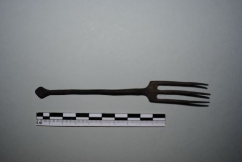 Forchetta a tre rebbi su base rettangolare. Manico a sezione poligonale, terminante in uno zoccolo.