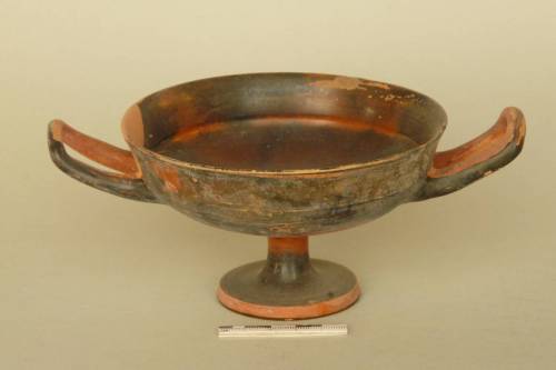alto orlo distinto dal corpo a profilo concavo, vasca poco profonda che si inserisce a curva continua nello stelo; anse orizzontali a bastoncello rialzate; piede a disco con orlo concavo e interno cavo. A risparmio: pannello e interno delle anse, orlo del piede e zona d'appoggio