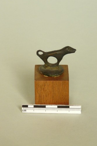base leggermente convessa con risega inferiore per l'alloggiamento sul vaso e presa configurata ad animale stilizzato (cane? cinghiale?): la figurina, protesa in avanti e con coda ad anello verso l'alto, ha le zampe anteriori e posteriori unite sulla base a formare un ulteriore anello. Il muso è stilizzato, tozzo, con occhi e bocca indicati da solchi incisi e sul collo ha una corta criniera. Probabilmente l'animale è stato inserito sul coperchietto in un secondo momento
