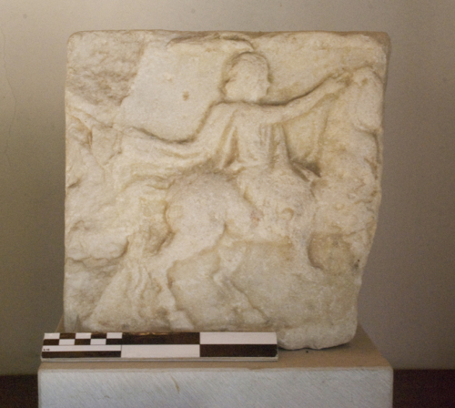 Il pezzo rientra in un numero di esemplari ampiamente distribuiti dalla fine del V sec. a.C.-inizi IV sec. a.C. fino alla tarda età romana, dall'Attica e dalla Beozia all'Asia Minore e alle isole greche, fino anche all'area danubiana dove questo tipo di immagine trovò una codificazione specifica nelle iconografie del cavaliere trace e dei cavalieri danubiani. Il cattivo stato di conservazione e la modestia dell'esecuzione rendono piuttosto complesso inquadrarne il puntuale schema iconografico, poichè l'immagine del cavaliere viene adottata in più iconografie con funzione diversa (votiva, funeraria, raffigurazioni imperiali e private).