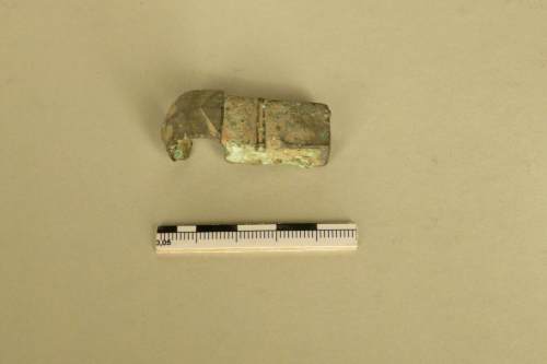 elemento parallelepipedo cavo con probabile anello terminale spezzato; l'altra estremità dell'elemento presenta un'apertura quadrangolare; a metà della "scatola" doppia modanatura