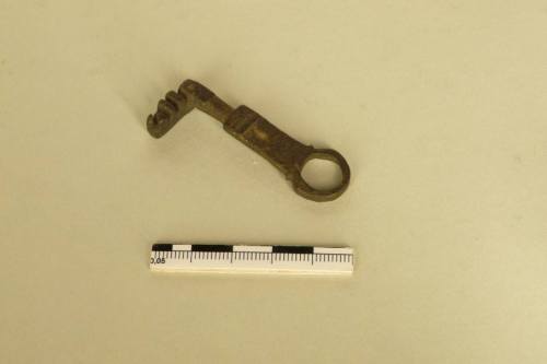 faceva parte di un sistema con chiave a scorrimento e stanghetta di serratura fermata da asticciole d'arresto verticali, diffuso in età romana per porte e mobili. La datazione alla piena età impetriale è proposta poiché l'esemplare sembra un'evoluzione delle più antiche chiavi in ferro, delle quali conserva però un robusto fermo-porta