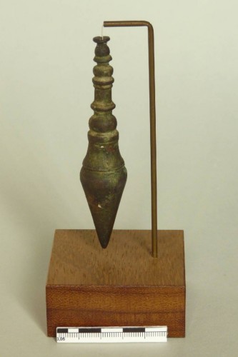 si tratta certamente di un peso per filo a piombo, ma non sembra collocabile in età romana, poiché i pesi noti (sia gli esemplari che quelli raffigurati sulle stele funerarie) sono sempre molto semplici, conici, con appiccagnolo per l'inserzione del filo