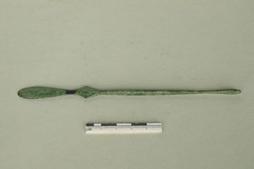 spatola a foglia che si allarga a formare una losanga all'attacco con lo stelo zigrinato, leggermente rastremato in corrispondenza dell'estremità ad oliva.