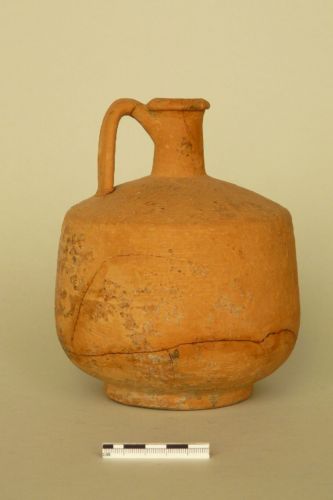 orlo leggermente estroflesso e ingrossato, a sezione triangolare, breve collo cilindrico, corpo cilindrico a doppia carena, meno accentuata nella parte inferiore, fondo piatto con piede a disco. Ansa a nastro bicostolata impostata sotto l'orlo e appena sopra la spalla. Argilla arancio depurata.