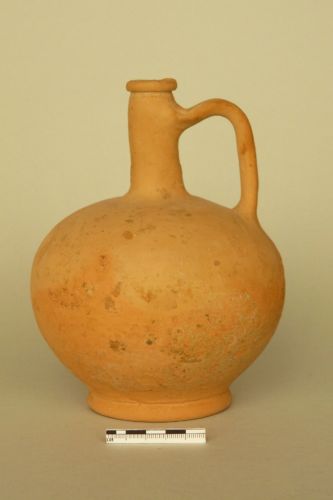 orlo distinto e ingrossato, alto collo cilindrico, spalla arrotondata, ventre globulare,fondo piatto con piede a disco. Ansa a nastro bicostolata saldata sul collo, sotto l'orlo e sopra la spalla. Argilla giallo-arancio depurata.