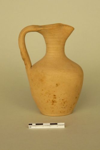 orlo trilobato, collo cilindrico su cui è presente una decorazione a solchi paralleli, spalla arrotondata, ventre troncoconico,fondo piatto. Ansa a nastro saldata all'orlo e sulla spalla. Argilla beige-rosato depurata.