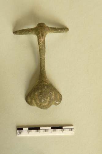 ansa verticale ad andamento sinuoso di piccolo vaso, forse una brocca o una bottiglia. Residuo di un poggiapollice a forma di rocchetto e bracci laterali molto consunti, ma probabilmente in origine caratterizzati (a testa di palmipede?). Il fusto, con accenno di solcatura mediana verticale, ha l'attacco inferiore trilobato con margini ingrossati; al centro del lobo centrale è una testa femminile molto consunta, forse una baccante
