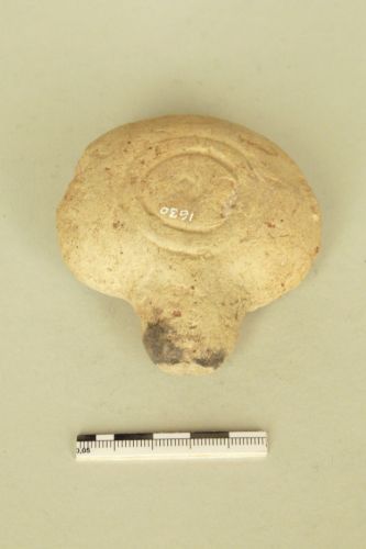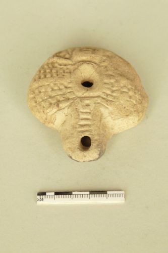 corpo costituito da due parti troncoconiche molto appiattite, la cui metà superiore costituisce la spalla della lucerna, molto larga, sulla cui superficie è stata raffigurata nella parte anteriore, la testa e le zampe anteriori della rana, sopra il foro del becco, sul quale c'è un motivo a scala, mentre sul lato opposto al becco le zampe posteriori. Negli spazi rimanenti, ai lati del disco, è presente un motivo a sei file di "chicchi di grano" per parte, ottenuto incidento linee verticali e orizzontali intersecantisi ad angolo retto tra loro. L'infundibulum è centrale e il fondo ad anello appiattito presenta il marchio "B" tra due circonferenze incise. Argilla giallo chiaro depurata.