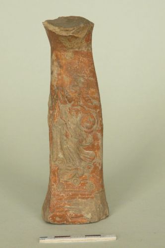 supporto di lucerna decorato con una figura femminile in rilievo: Minerva su un carro, di profilo a destra, stante sulla destra con la gamba sinistra leggermente flessa e scostata, che indossa il chitone, tiene con la mano sinistra lo scudo rotondo e con la destra la lancia; sul capo indossa l'elmo corinzio (?) con alto lophos. Argilla beige con vernice rossa