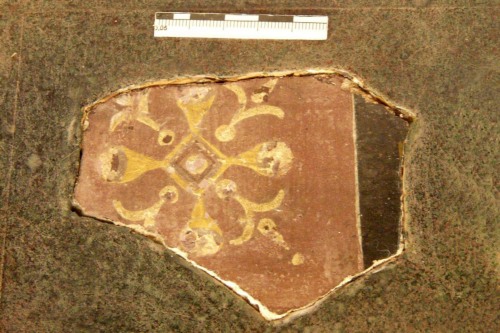 frammento di fascia viola su fondo nero, decorata da un fiore molto stilizzato, a quattro petali gialli con sfumature viola e rosso scuro. I petali si dipartono dai vertici di un quadrato viola, bordato di giallo, che racchiude un punto rosso con profilatura gialla. Negli spazi tra i petali si trovano fiori di loto gialli, molto semplificati, che presentano alla base punti rossi profilati di giallo, analoghi a quello centrale. Il motivo decorativo è concepito in modo astratto e i singoli particolari che lo compongono portano ad un esito puramente decorativo.