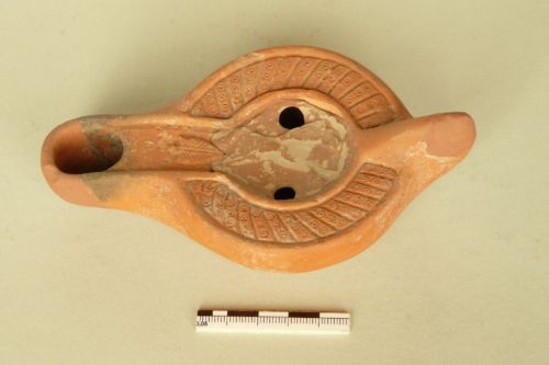 serbatoio rotondo, becco a canale allungato,decorato con una palmetta, ben distinto dal corpo e con tracce di riduzione, ansa piena e triangolare che divide la decorazione di spalla in due fasce racchiuse tra due piccoli bordi, ciascuna con decorazione costituita da linee trasversali alternate a un motivo costituito da tre piccoli occhi di dado. Sul disco, non pertinente e frutto di un vecchio restauro, è raffigurato un cavallo in corsa tra i due infundibula. Sulla base, delimitata da un anello a rilievo, collegato all'ansa da una nervatura sono presenti due cerchi concentrici. Argilla beige; vernice arancio opaca.
