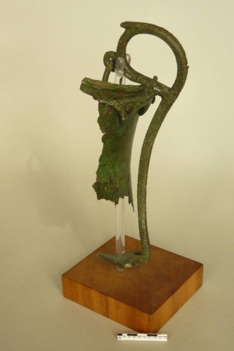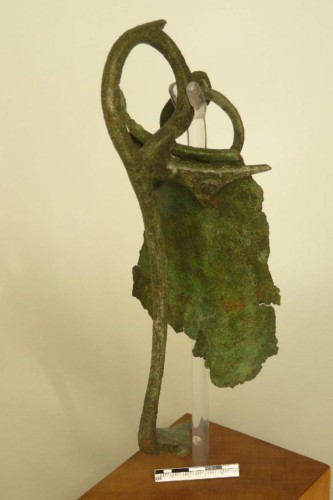 labbro distinto convesso con orlo leggermente rientrante, parete svasata, ansa con attacco superiore a triangolo espanso con lati concavi, applicato sotto il labbro con due ribattini; il fusto forma nella parte alta un grande occhiello quasi circolare, sormontante e aggettante l'imboccatura e scende in verticale lungo la parete. Sul lato interno dell'occhiello, in alto, corta apendice poggiapollice e, in basso, piccolo anello